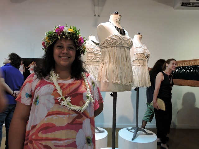 « Avec le centre des métiers d'art, on a réalisé une exposition au Musée de Tahiti et des îles, j'avais travaillé les cordes et les attaches. Pour mon diplôme, j'ai voulu continuer sur ce thème. J'ai d'abord fait des tentures murales, ensuite, en les regardant, j'ai voulu que ça se porte, je me suis tournée vers les vêtements. J'ai continué ensuite avec la gravure toujours avec ce système de nœuds et d'attaches, de macramé. »
