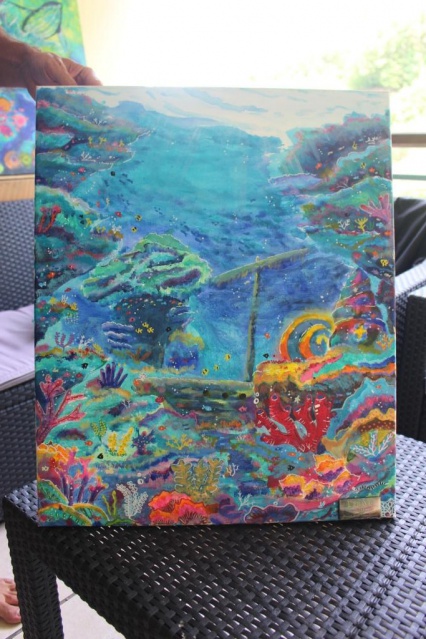 Autodidacte, il aime les couleurs, le bleu en particulier, il intègre souvent des animaux, raconte les fonds sous-marins, témoigne de son souci d’une consommation plus durable, d’un respect plus grand pour l’environnement. Il fait un peu d’abstrait, s’essaye depuis peu aux portraits. “C’est en pratiquant que l’on fait ses meilleures armes.” Enfin, il ajoute toujours lorsqu’il est au bout de sa création, “la vibration”. Sans elle, il considère ses toiles inachevées.