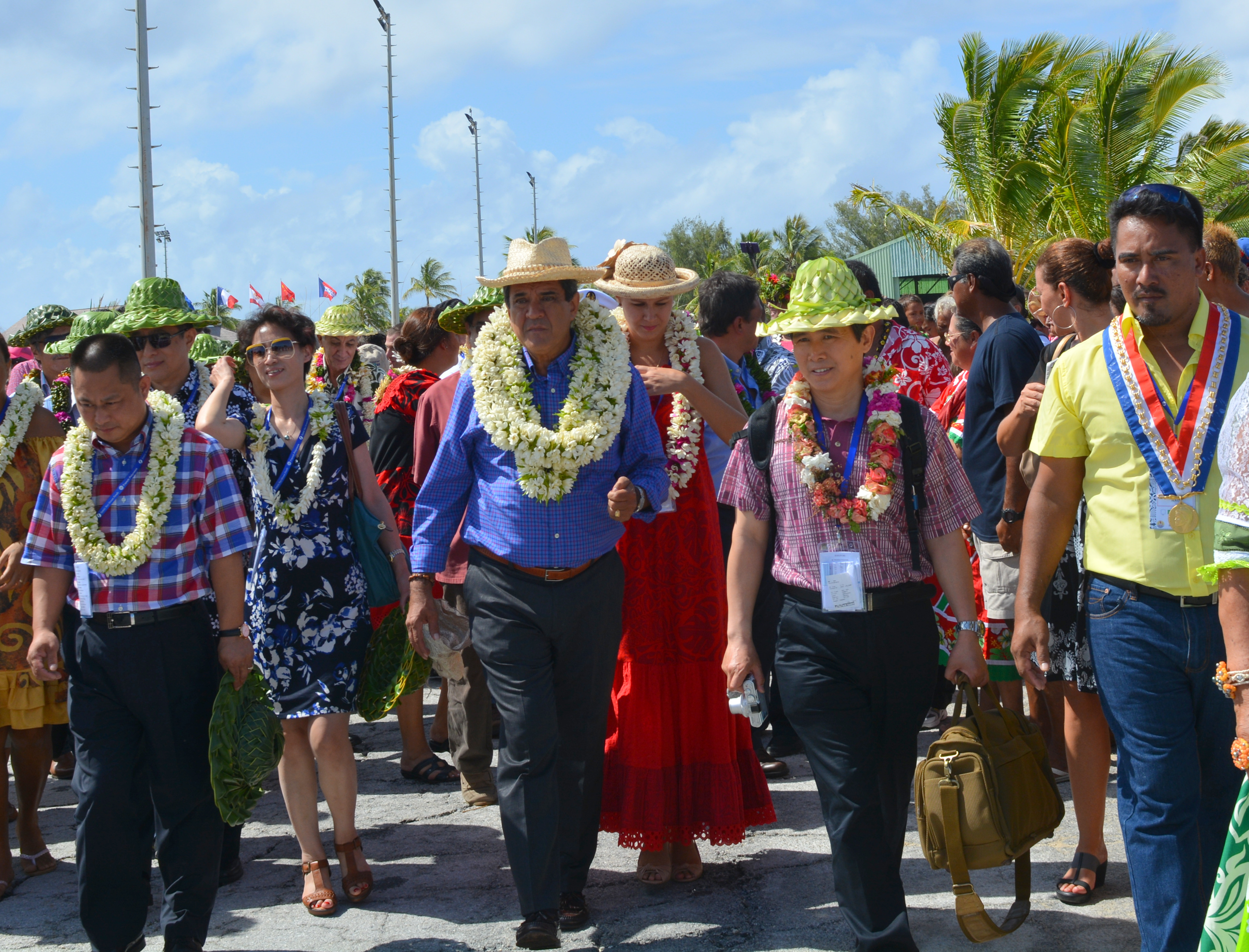 Le 6 mai 2015 à Hao, pour l'inauguration du projet de complexe aquacole, Edouard Fritch, le président du Pays avec les investisseurs chinois du groupe Tian Rui et le tavana de la commune, Théodore Tuahine.