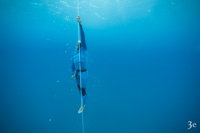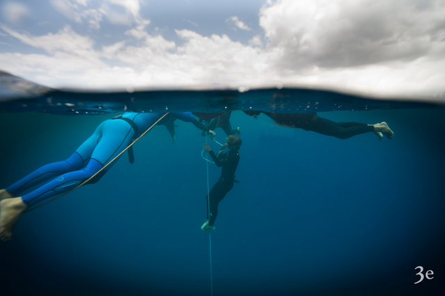 Enfin, le groupe s’essaye à l’apnée sur une ligne. Il peut tester différentes techniques comme l’immersion libre, le poids constat (sans toucher la ligne et en conservant le même lest avec ou sans palmes) et le poids variable (le plongeur est lesté à la descente et remonte sans le lest avec ou sans palmes).