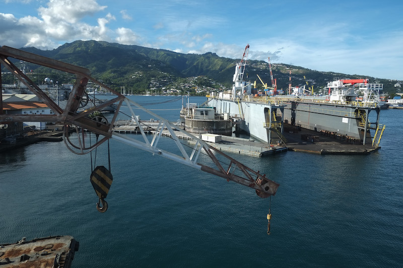 Parlant de construction navale, un second sujet – encore plus concret – a également animé plusieurs des débats mercredi matin : celui de l'opportunité pour le Pays de se doter de son propre “dock flottant”. Depuis plusieurs décennies, c'est le dock de l'Armée qui est utilisé dans le Port de Papeete pour les besoins des navires civils. “Mais aujourd'hui, les besoins des armateurs dépassent la capacité du dock de la Marine. Donc, il y a deux questions”, explique le contre-amiral Geoffroy d'Andigné. “D'une part, celle de l'avenir et de la capacité du dock. Aujourd'hui, il est valide jusqu'en 2030 et il pourrait être prolongé. Les choses sont à l'étude et, des éléments dont je dispose, une décision devrait être prise d'ici 2025. D'autre part, il y a la question du volume, des emplacements et de ce qu'on fait avec ce dock. Et là, les besoins de la Marine pour son dock ne convergent pas avec les besoins du Port.”