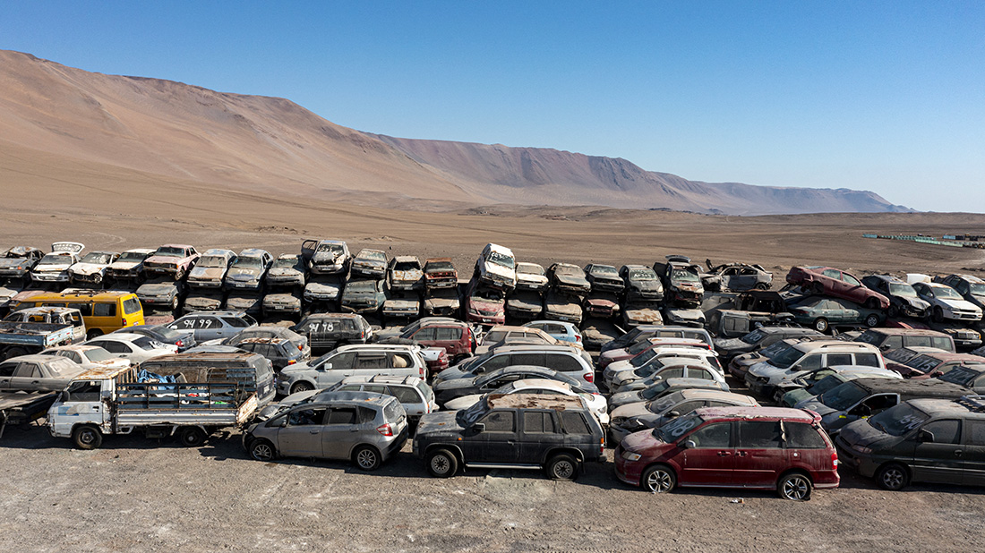 Dans la ville voisine d'Iquique, ce sont des milliers de voitures désossées provenant des Etats-Unis, du Japon ou de Corée qui s'entassent, tandis que dans d'autres zones de ce désert de plus de 100.000 km2, le paysage est défiguré par des centaines de pneus.