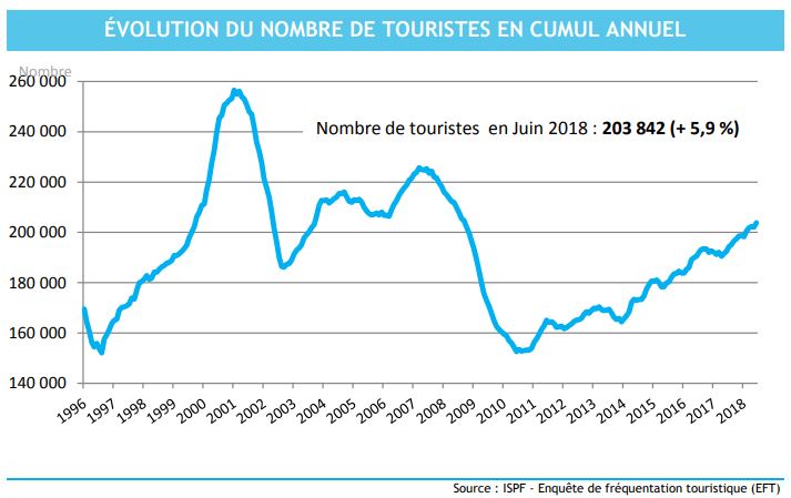 D'abord les bonnes nouvelles : la fréquentation touristique de la Polynésie française progresse de 10,1% par rapport à juin 2017, avec 203 842 visiteurs sur 12 mois glissants. C'est le deuxième mois de suite que la Polynésie dépasse le seuil des 200 000 visiteurs. Une performance que nous n'avions plus accomplie depuis 2009 !