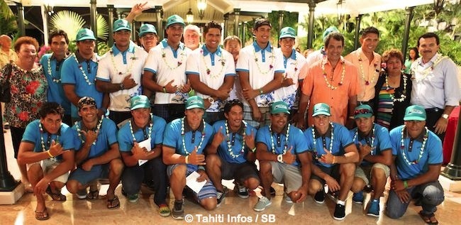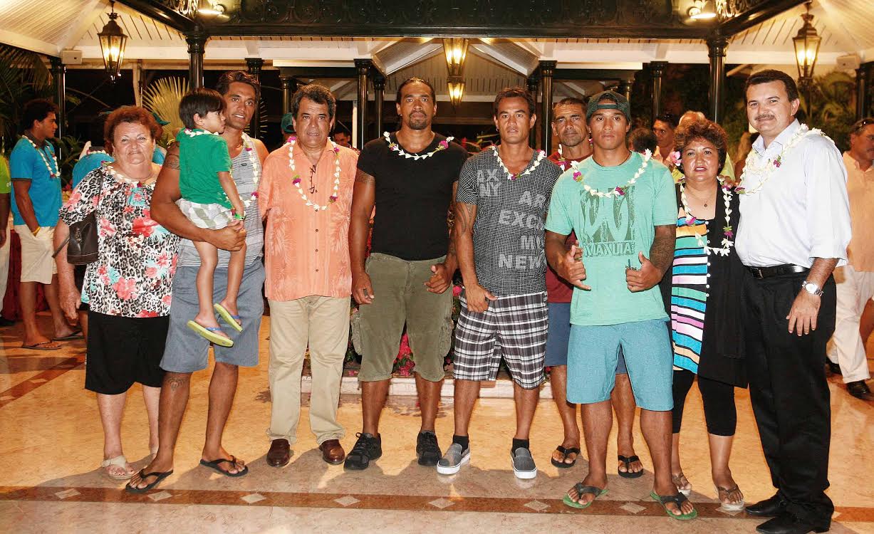 PAPEETE, le 12 novembre 2014. Au lendemain des éditions Hawaiki Nui et Moloka'i Hoe 2014 de toute beauté, les rameurs d’Edt ainsi que ceux de Shell ont été conviés à la présidence pour un cocktail dinatoire. Les instances du va’a étaient également présentes représentées par Doris Hart la présidente de la fédé, Elise Maamaatuaiahutapu la présidente du comité Hawaiki Nui, le directeur administratif de la fédération Henri Guilbaut, Alfred Mata le directeur de course et bien d’autres…
