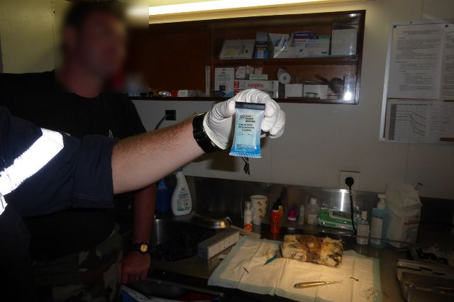 Des colis de cette nature ayant déjà été découverts sur l’atoll, le personnel sur place s’est montré particulièrement vigilant dès son arrivée à terre. Le colis a été transporté à bord du Prairial afin de déterminer la nature exacte de la marchandise contenue dans le colis. Après expertise par le commissaire du bord, il s’est avéré que le colis contenait bien de la cocaïne. A l'intérieur, il y avait pas moins d'1.2 kilo de drogue.