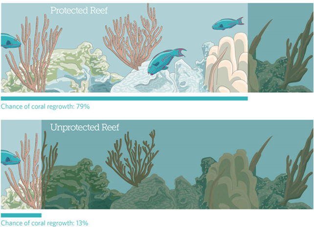 Au niveau mondial, les récifs coralliens recouvrent une faible surface des océans, environ 0,15 % seulement, mais ils abritent près d’un tiers de toutes les espèces marines connues à ce jour. Véritables oasis de vie, ils assurent la subsistance de plus de 500 millions de personnes dans le monde grâce notamment à la pêche. Ils sont aussi indispensables à la protection des côtes contre l’érosion et à l’attrait touristique des îles. Les coraux sont extrêmement sensibles aux changements d’origine anthropique de l’environnement comme le réchauffement des eaux, l’acidification des océans, qui s’ajoutent aux perturbations locales comme la pollution, la sédimentation ou la surpêche. Selon la plateforme océan-climat, on estime actuellement qu’environ 20 % des récifs ont définitivement disparu au niveau mondial, 25 % sont en grand danger et 25 % supplémentaires seront menacés d’ici 2050 si aucune action n’est menée. Les moyens les plus efficaces pour protéger durablement les récifs sont de réduire drastiquement les émissions de gaz à effet de serre, responsables de l’augmentation des températures, mais aussi de créer des réserves marines côtières, qui favorisent la résilience du corail face au changement climatique. Une étude récente montre que des coraux protégés par une réserve ont six fois plus de chances de se régénérer suite à un phénomène de blanchissement. Les experts de l’Union Internationale pour la Conservation de la Nature (UICN recommandent une protection stricte de 30% des habitats marins, aussi bien dans les lagons qu’au large, pour pouvoir continuer à tirer des bénéfices durables de ces écosystèmes. Actuellement, seules 3% des eaux de la planète sont protégées selon l’organisation MPAtlas.