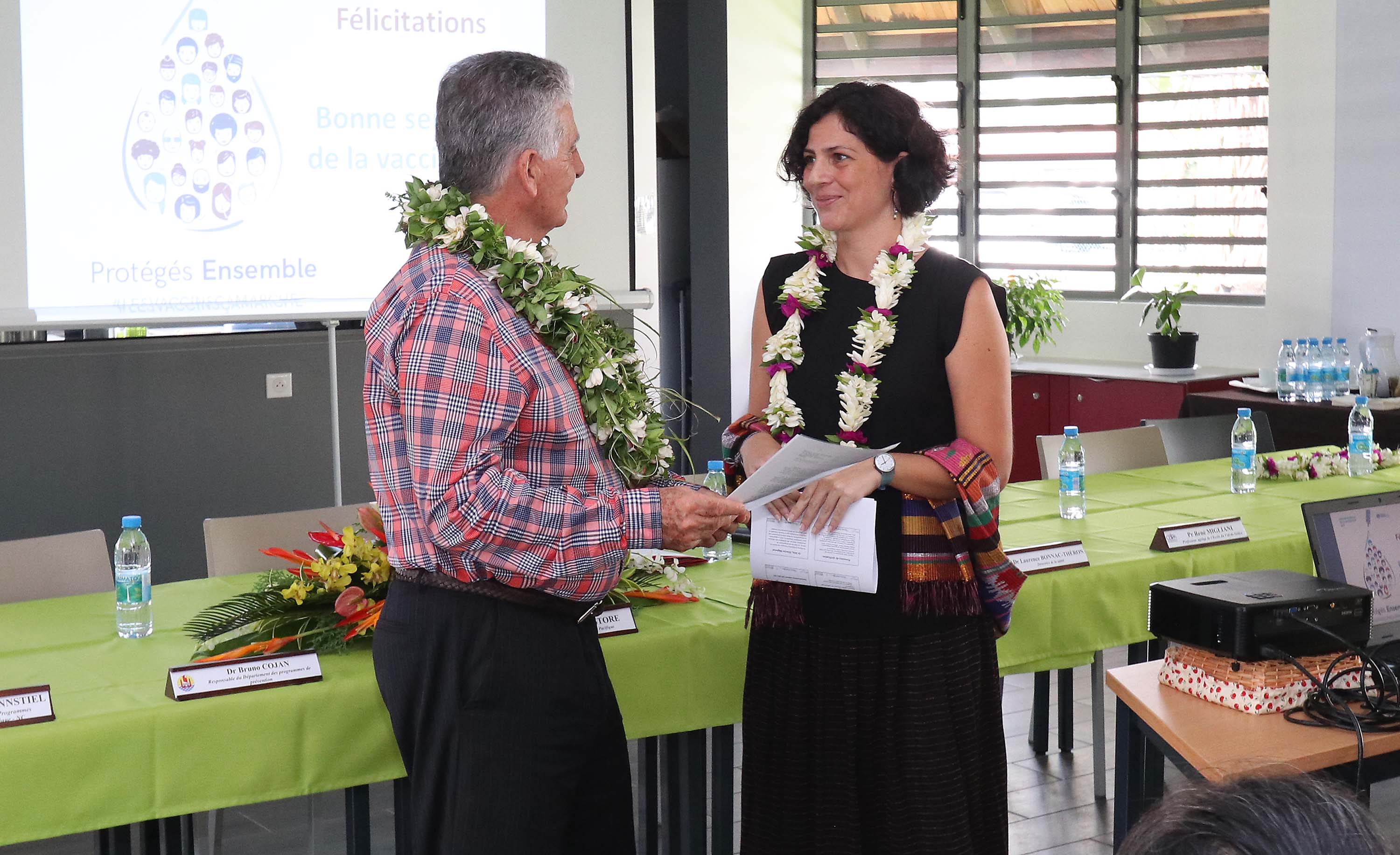 Le Dr Roberta Pastore, a remis hier au ministre de la Santé de la Polynésie française, Jacques Raynal, un certificat officialisant l'élimination de l'hépatite B en Polynésie chez les enfants. Crédit présidence de la Polynésie française.