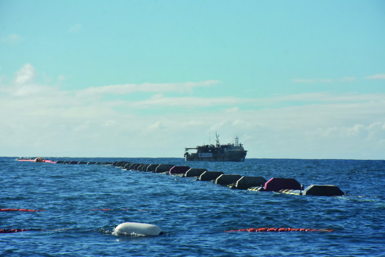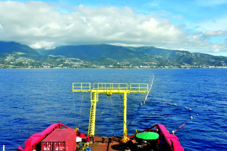 C'est avec une météo propice sans vent ni houle que le coulage de la troisième et dernière partie du Swac (S3) a débuté hier en début d'après-midi au large de Pirae. Cette dernière partie est également la plus longue (2400 mètres), ce qui rend l'opération très délicate. Nicolas Brigato, le gérant de la société sous-traitante de travaux maritimes Ti ai moana l'explique. “Il y a une route bien précise à suivre pour couler cette longue et dernière section. Il faut le couler “en S” donc il faut faire attention à pas le plier et à le descendre exactement au bon endroit puisqu'il va falloir le connecter avec la section 2 qui est déjà immergée au milieu de la passe”.