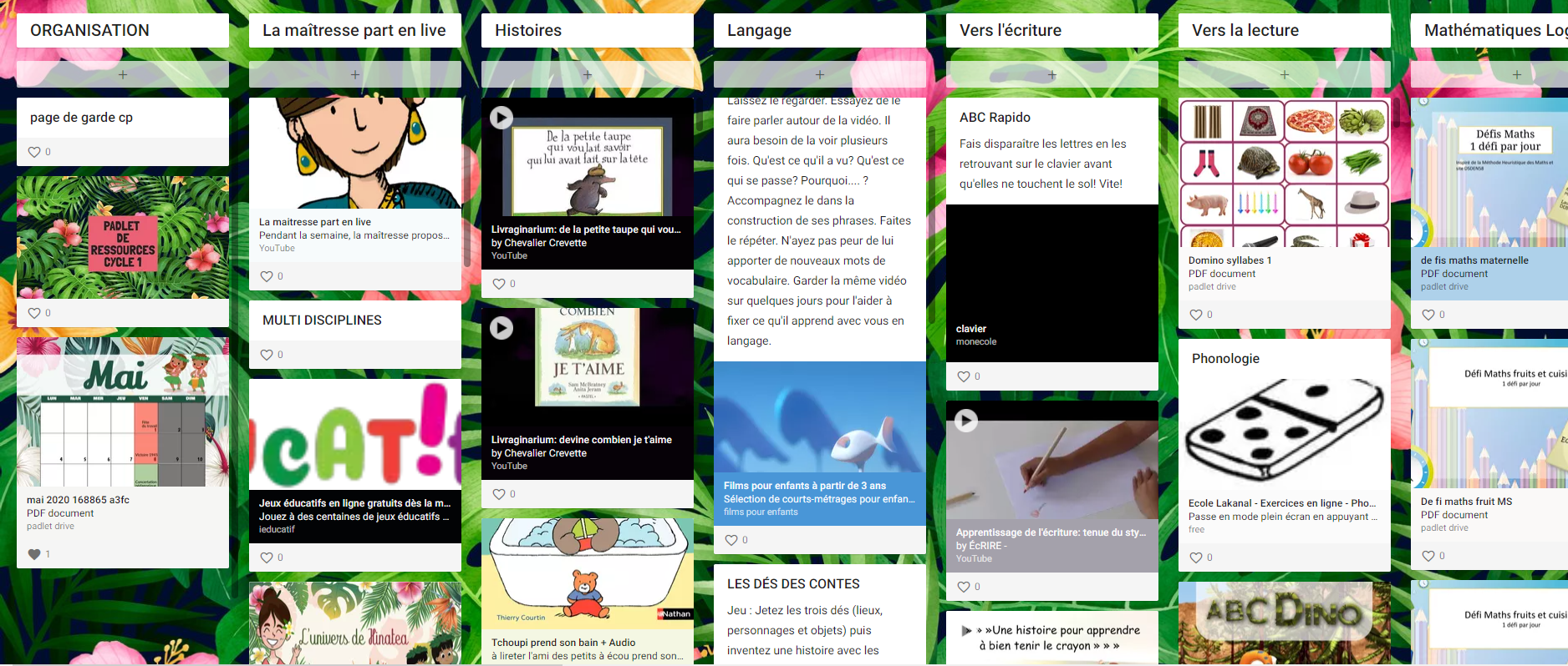 Tu y trouveras différents onglets comme : "Organisation", "Histoire", "Langage", "Mathématiques" mais aussi "La maîtresse part en live" !