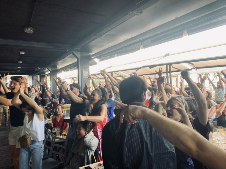 La plupart des bars et des restaurants de Papeete débordaient de fans de football mercredi matin. Le restaurant Les 3 Brasseurs à Papeete, habituel lieu de rencontre des supporteurs, n’a pas fait exception à la règle. Plus de 300 personnes étaient ainsi massées devant les écrans installés pour l’occasion. Tous les ingrédients étaient réunis pour une ambiance de folie et une ferveur indescriptible. “L’ambiance est superbe, les gens sont super joyeux, c’est vraiment un plaisir d’assister au match ici en Polynésie” clame Hugo, qui n’a pas hésité à mettre entre parenthèses quelques heures ses vacances en famille pour venir assister au match. C'est au son du coup de sifflet final que, dans un même cri, les supporteurs ont exulté. Pendant de nombreuses minutes, la Marseillaise fut chantée à pleins poumons. Et pour la plupart, fin de match ne rime pas avec fin de la fête, “On est en finale, c’est génial ! On va quand même rester fêter la victoire, la journée ne fait que commencer” affirme Sébastien. Pour les Bleus, le répit sera de courte durée, car ils auront la lourde tâche de défendre leur titre dimanche contre l’Argentine, pour, pourquoi pas, accrocher une troisième étoile au maillot tricolore.