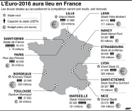 Il faudra 1,7 milliard d'euros rien que pour les 12 stades (dont trois de réserve). En plus du Stade de France à Paris, le projet français prévoit des rénovations (Parc des Princes, stades de Lens, Toulouse, Marseille, Strasbourg, Saint-Etienne et Nancy) ou des constructions de nouvelles enceintes (à Lille, Bordeaux, Nice et Lyon).
