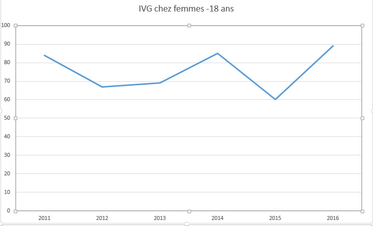 Le taux de recours à l’IVG chez les moins de 18 est quant à lui en hausse. Il est passé de 67 en 2012 à 89 en 2016 soit une hausse de 32,84% en quatre ans. Le chiffre connait d'ailleurs un pic entre 2015 et 2016 passant de 60 IVG chez les moins de 18 ans à 89. Une augmentation de 48,33% en un an.