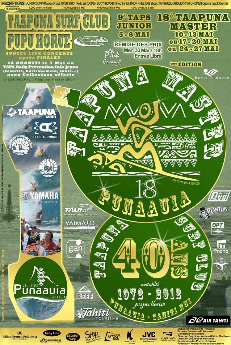Cette année, le Taapuna Surf Club crée en 1972 fête ses 40 années d’existence et compte bien marquer le coup en organisant une manifestation d’envergure en collaboration avec la Ville de Punaauia, la Fédération Tahitienne de Surf, diverses associations et de nombreux partenaires que le club tient à remercier.