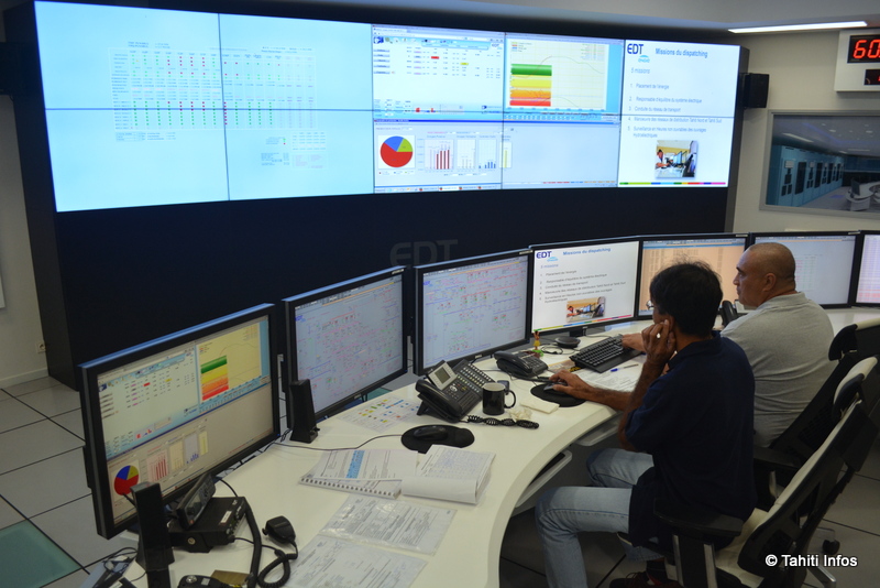 La salle de dispatching toute neuve installée dans la centrale Émile Martin de la Punaruu a été entièrement mise à jour il y a six mois. De cette salle, les techniciens d'EDT commandent tout le système électrique de Tahiti, c'est le nœud central du réseau.