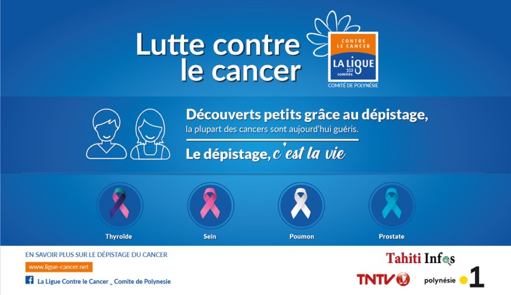Parce que la très grande majorité des cancers se soignent, quand ils sont découverts tôt, la Ligue contre le cancer vient de lancer une grande campagne de sensibilisation dans la presse en faveur du dépistage. À travers différents petits clips d’une minute environ et d’affiches, le Comité de Polynésie française de la Ligue contre le cancer axe son action sur quatre cancers majeurs en Polynésie : thyroïde, sein, poumon et prostate. Le message est simple et efficace, le dépistage précoce est le meilleur moyen de sauver des vies.