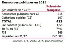 Nous y apprenons qu'en 2015, le Secteur des administrations publiques a dépensé 422 milliards de francs en Polynésie française, soit 74% de notre produit intérieur brut (PIB, représentant l'ensemble de la richesse produite sur le Territoire pendant l'année). Pour comparaison, en Métropole la dépense publique représentait 53% du PIB la même année.