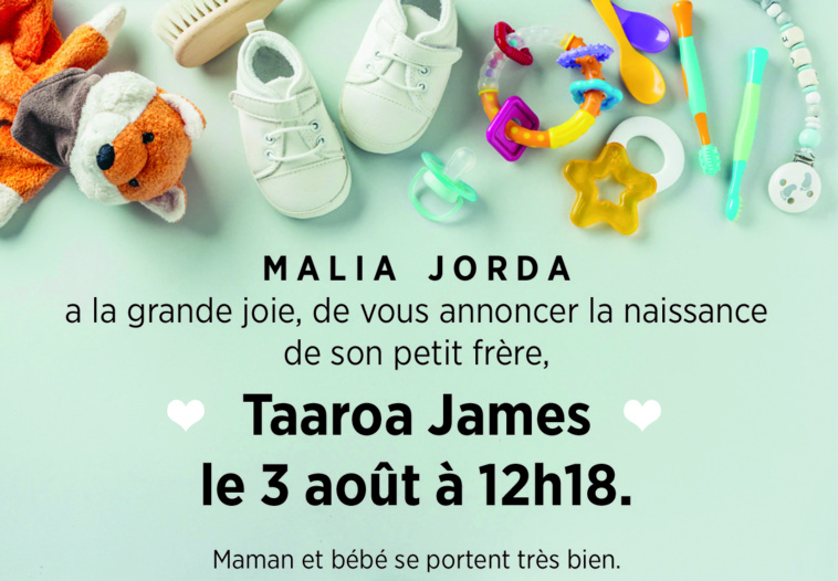 La famille JORDA a l'heureux plaisir de vous annoncer la venue au monde de TAAROA JAMES