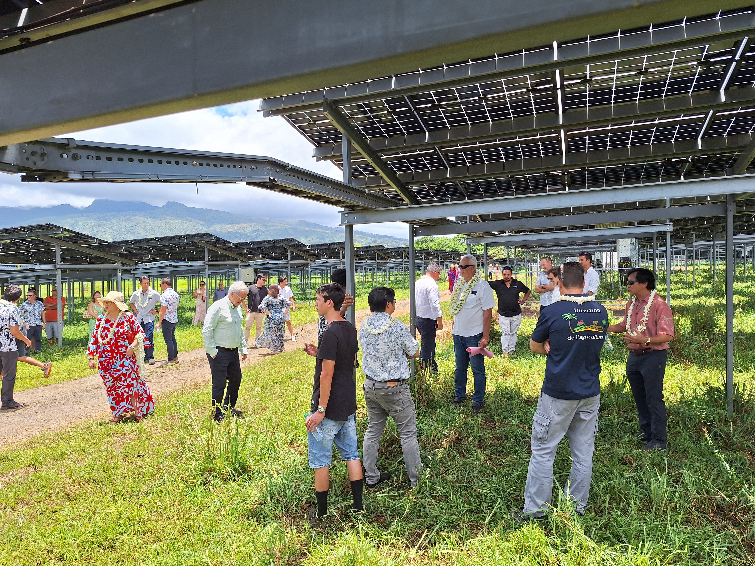 Malgré une saison des pluies déjà bien marquée, la météo était au beau fixe, mercredi, à Taravao, pour l’inauguration de la ferme agrisolaire Mahana O’Hiupe du groupe Siu, en famille et en présence de nombreux partenaires. Au terme de 21 mois de travaux, plus de 24 000 panneaux solaires ont été installés sur 12 hectares de pâturages, pour une capacité de production de 10 MWc, soit l’alimentation de plus de 5 000 foyers.