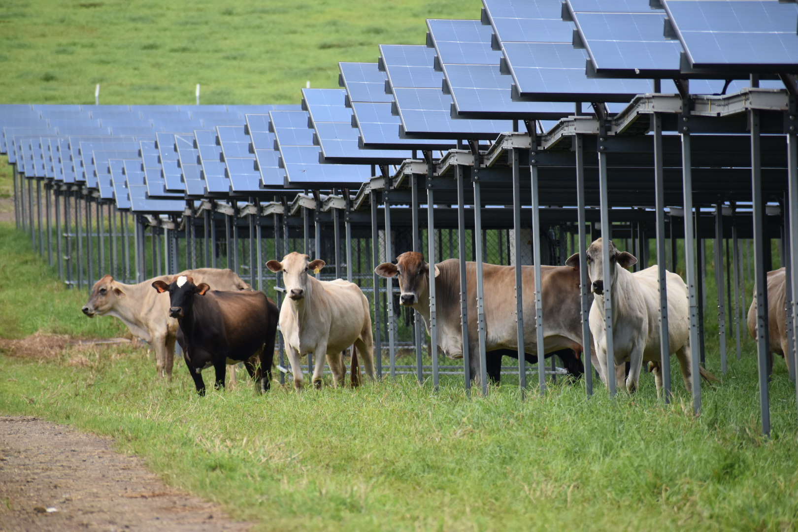L’émotion était palpable pour Georges Maau-Raoulx, 71 ans, éleveur de père en fils et propriétaire du terrain : “C’est un projet de longue haleine. Les vaches s’habituent très bien. J’espère que ça va inspirer d’autres éleveurs.” L’exploitation a été divisée en deux parcelles afin d’établir des cycles de pâturage d’une semaine. Sous les panneaux surélevés entre 3 et 4 mètres de hauteur, les bovins trouvent de l’ombre, mais aussi de l’herbe. Pour favoriser la pousse, l’espacement entre les structures a été étudié, et la société a opté pour des panneaux solaires bifaciaux, qui présentent aussi l’avantage de capter 7% d’énergie supplémentaire. L’ancien ministre de l’Agriculture et président de la communauté de communes Terehēamanu, Tearii Alpha, a salué “un parfait exemple, avec une double ambition de transition énergétique et de maintien de l’élevage”.