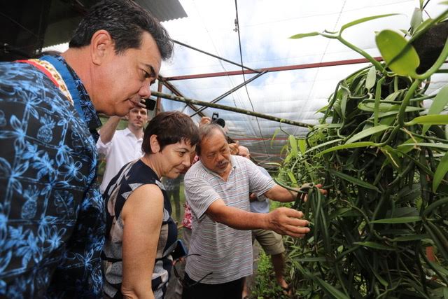 Tahiti, le 2 février 2020 - Au premier jour de sa visite officielle en Polynésie française, la ministre des Outre-mer, Annick Girardin, a visité une vanilleraie sur l'île de Moorea et évoqué l'état de la filière avec ses professionnels.