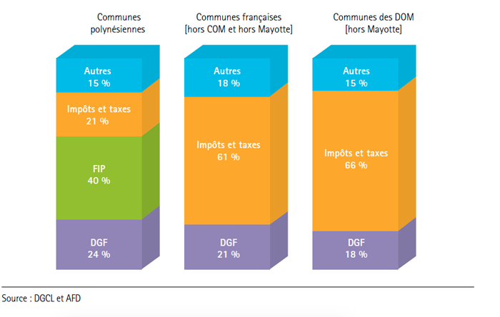 Dans son rapport 2014, l'Observatoire des communes de Polynésie française met en exerce la dépendance des communes au soutien financier et technique de l’Etat et du Pays. Sans subvention de ces deux entités, les communes polynésiennes ne peuvent pas assurer le minimum de leurs compétences. Et pour cause : la fiscalité locale communale est peu développée et les principales ressources financières des communes : la dotation globale de fonctionnement (DGF) versée par l’Etat et le Fonds intercommunal de péréquation (FIP) issu des taxes du Pays, échappent aux décisions des conseils municipaux. Faute de ressources suffisantes, certaines communes ont commencé à recouvrer des taxes communales comme la taxe sur l’électricité –instituée en 2011 dans 38 communes- ou la taxe de séjour, créée en 2011 également dans 14 communes. Mais les ressources de ces taxes locales sont encore très faibles.