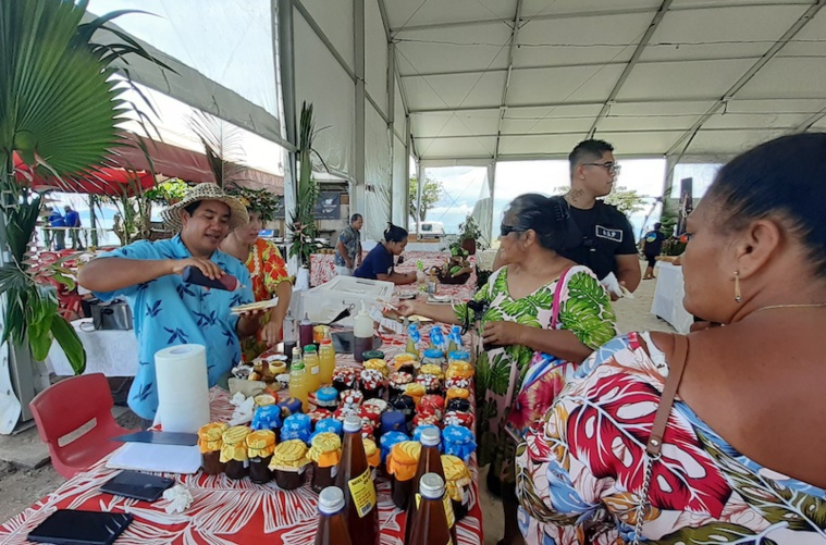 En déambulant sous le chapiteau ou à l’extérieur, on peut aussi trouver des stands de confitures artisanales fabriquées à partir de fruits locaux ou, plus original encore, des confitures à base de fleurs. Venue de Taha'a, Rachel Plancque propose des confitures de clitoria, d’hibiscus ou de tiare Tahiti. Associée à Manutea Moutame, qui a reçu le second prix du meilleur miel de Polynésie après celui des Marquises, ils expliquent que, pour eux, “la symbiose entre les fleurs et les abeilles étant naturelle, leur association allait de soi”. Singuliers aussi : des sirops préparés localement à base de gingembre ou de curcuma qui côtoient des produits pour la vaisselle complètement naturels.