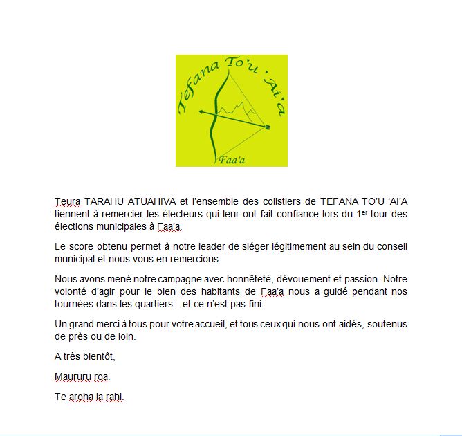 La liste Tefana To'u Ai'a remercie ses électeurs à Faa'a