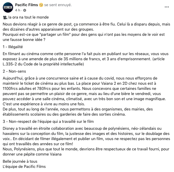 L'intention était louable, mais hélas tout n'est pas permis lorsqu'il s'agit du partage de produits commerciaux soumis à la propriété intellectuelle. En effet, ce mardi, les différentes salles de cinéma du Fenua ont mis le holà sur Facebook, sommant certains internautes d'arrêter de vouloir partager gratuitement, via leur réseau, le dernier film Disney, Vaiana 2. Ces derniers voulant permettre aux familles n'ayant pas les moyens de s'offrir une séance de cinéma de voir le film événement de cette fin d'année. Un geste de bon cœur mais qui est illégal. “En filmant au cinéma comme cette personne l'a fait puis en publiant sur les réseaux, vous vous exposez à une amende de plus de 35 millions de francs et trois ans d'emprisonnement selon l'article L.335-2 du Code de la propriété intellectuelle”, a réagi sur sa page Pacific Films. Les différents acteurs locaux du secteur ont d'ailleurs tenu à rappeler qu'ils s'efforcent déjà de maintenir le prix de leurs tickets au plus bas et que durant l'année, ils permettent à de nombreux organismes, mairies et établissements scolaires de faire des sorties cinéma.