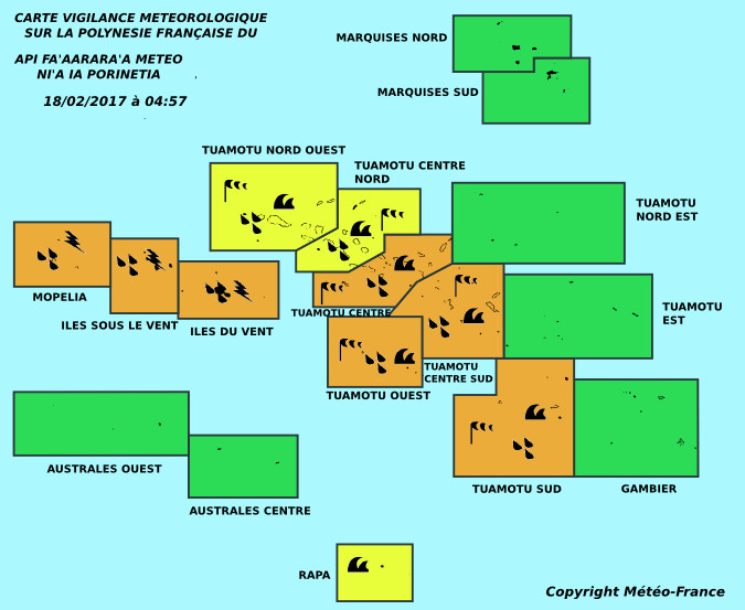 Du Nord-Ouest au Sud Tuamotu, vent assez fort de Nord-Ouest, rafales dépassant 110 kilomètres/heure. Vent faiblissant dimanche. Sur Nord-Est Tuamotu, vent d'Est faible à modéré. Sur le reste des Tuamotu et aux Gambier, vent modéré de Nord avec rafales à 60/70 kilomètres/heure. Dimanche, vent venant à l'Est sur le Nord, Centre et Est Tuamotu.
