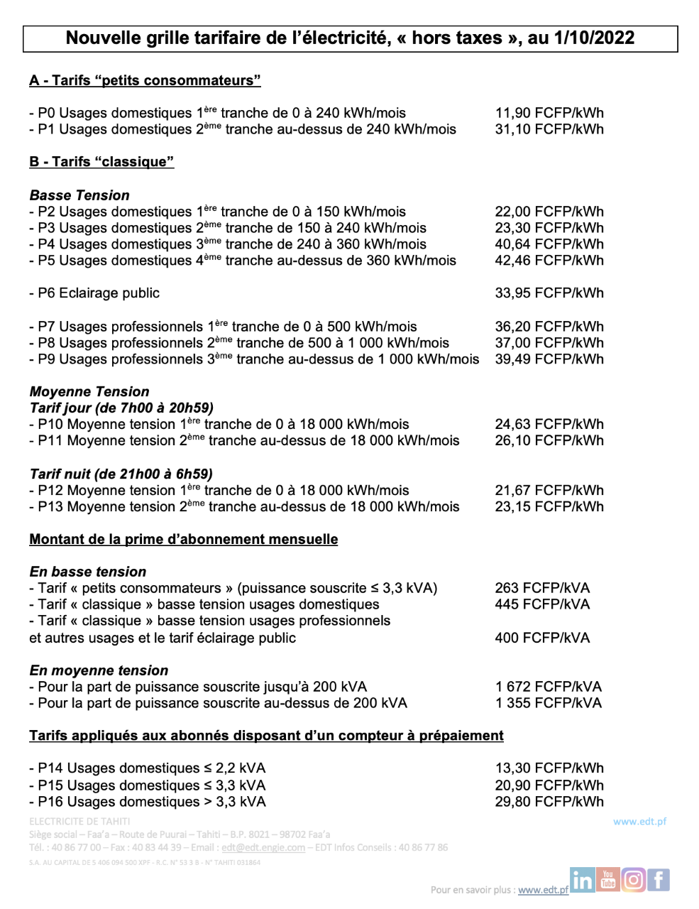 Tahiti, le 30 septembre 2022 – Suite à l'annonce de la hausse tarifaire de l'électricité à compter de ce samedi 1er octobre, EDT a communiqué ce vendredi la grille tarifaire exacte.