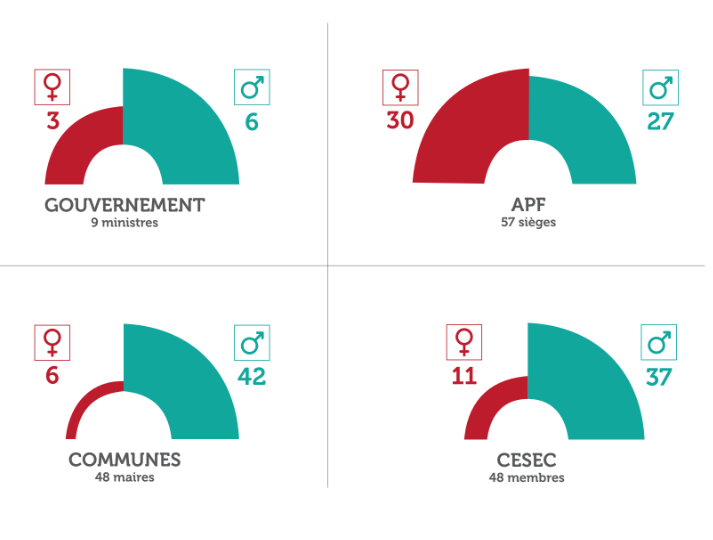 Le gouvernement, tout d'abord, ne compte aujourd’hui que trois femmes sur neuf ministres. Et s'il n'en dénombrait que quatre avant le dernier remaniement, ce déséquilibre reste un progrès en comparaison de l'unique femme présente sous le premier gouvernement Flosse de 2013, Béatrice Chansin –rejointe quelques mois plus tard par Manolita Ly– et en comparaison également de l'unique femme ministre sous le précédent gouvernement Temaru de 2011, Chantal Tahiata. Notons par ailleurs que l'exécutif polynésien n'a jamais compté de femme présidente ou vice-présidente du Pays. Des gouvernements "composés pour l’essentiel d’hommes" qui "ne sont pas toujours moteurs" en faveur de l’égalité, avait fait remarquer l'ex-élue et ministre, Armelle Merceron, dans son dernier "bilan de la parité légale obligatoire en Polynésie" réalisé en 2018.