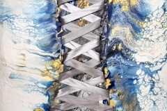 Pour plus de clarté, il affiche ses œuvres sur sa tablette. Il décrit ses Tour Eiffel, plus ou moins réalistes et détaillées. Elles représentent Paris, la ville de la haute couture. Il montre là un lacet, ailleurs une fermeture éclair, une épingle à nourrice ou bien de la dentelle. Dans chaque tableau se trouve un accessoire. Il y a une véritable mise en scène. Il a varié et ses supports (verre, toile cirée, plastique, toile…) et, pour faire entrer ses accessoires, il les a ouverts au cutter quand c’était possible. Il décrit la Petite robe noire, commente ses personnages et bâtiments parfois à peine reconnaissables.