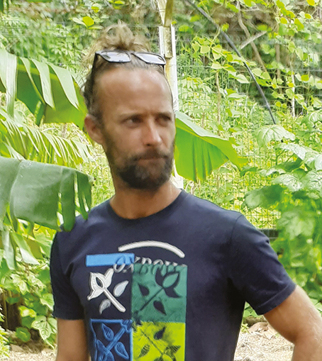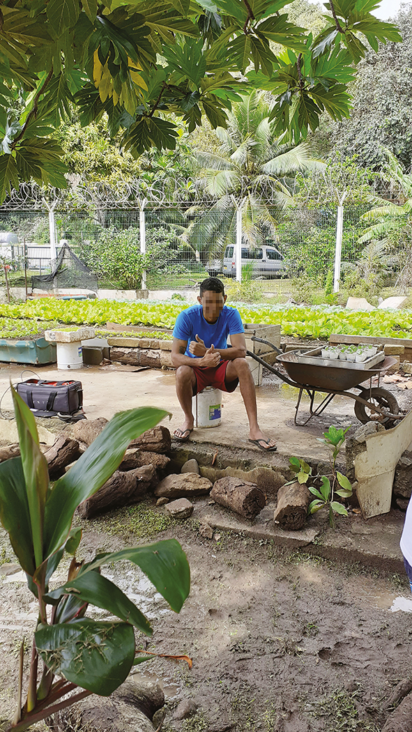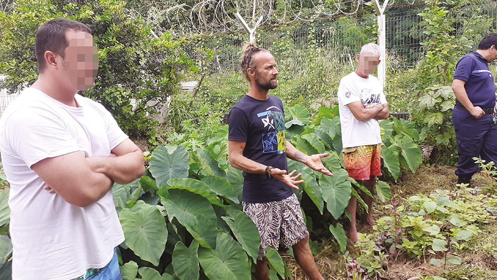 “En parallèle de mon métier dans l’enseignement, en Nouvelle-Calédonie, j’ai découvert là-bas la permaculture. D’abord en autodidacte puis grâce à la formation dispensée par un grand semencier, j’ai intégré l’association Male’va, qui s’inscrit dans un mouvement de souveraineté alimentaire. Par le biais de cette association, nous avons accueilli un Canadien qui, sur un éco-lieu où fut fondée la première maison de la semence, nous a formés au programme PDC (Permaculture Design Course). De là j’ai pu proposer des formations en arrivant en Polynésie. J’avais déjà, dans le passé, travaillé pour des associations de réinsertion, avec des handicapés et j’ai animé ici, à Raiatea, un atelier permacole basé sur le volontariat au LUT (lycée des îles Sous-le-Vent) et il y a trois ans, j’avais soumis mon dossier au ministère de la Justice pour travailler en centre pénitencier. Au départ, ils n’avaient pas de fonds prévus, mais cette année, ils m’ont rappelé et je suis ravi de pouvoir animer cet atelier car l’administration comme les détenus sont très favorables au projet. La preuve, c’est que l’atelier est basé sur le volontariat et tous les détenus y adhèrent. Ils sont très demandeurs et par exemple, dans peu de temps, deux détenus sortiront de prison et ils sont déjà prêts à planter et à entretenir leur terrain à partir de leur expérience en prison. Moi, au niveau du jardin, je transmets un grand principe qui est d’implanter des plantes vivaces et sauvages en prenant soin du sol en le nourrissant. Je transmets ce que je suis et chacun fera sa propre expérience ensuite.”