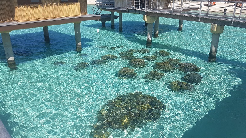 Le Conrad, le Four Seasons, les Intercontinental (Moana et Thalasso), le Bora Bora by Pearl Resort, le Maitai (ainsi que le Taha'a Relais et Château sur l'île de Taha'a), possèdent également une foule de récifs coralliens sous leurs bungalows. Ils sont régulièrement entretenus et choyés par les membres de l’équipe d’Espace Bleu, mais un élément est aussi important que l’intervention des professionnels, celle des visiteurs. Ils doivent impérativement se rendre compte que le corail n’est pas un caillou ou une roche allant au grès des courants, mais réellement un animal vivant.