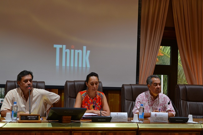 Aux côtés de Winiki Sage, le président du CESC, Tea Frogier la ministre de la solidarité accompagnée de Luc Tapeta, conseiller spécial du président Fritch chargé des travaux sur la réforme de la PSG II.