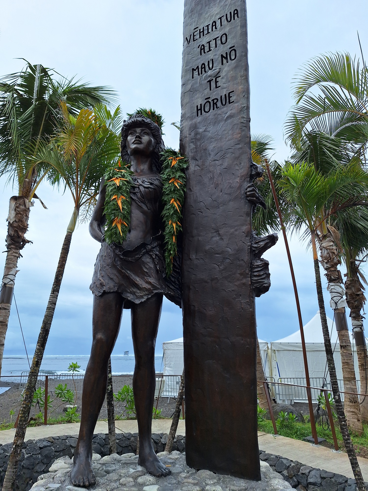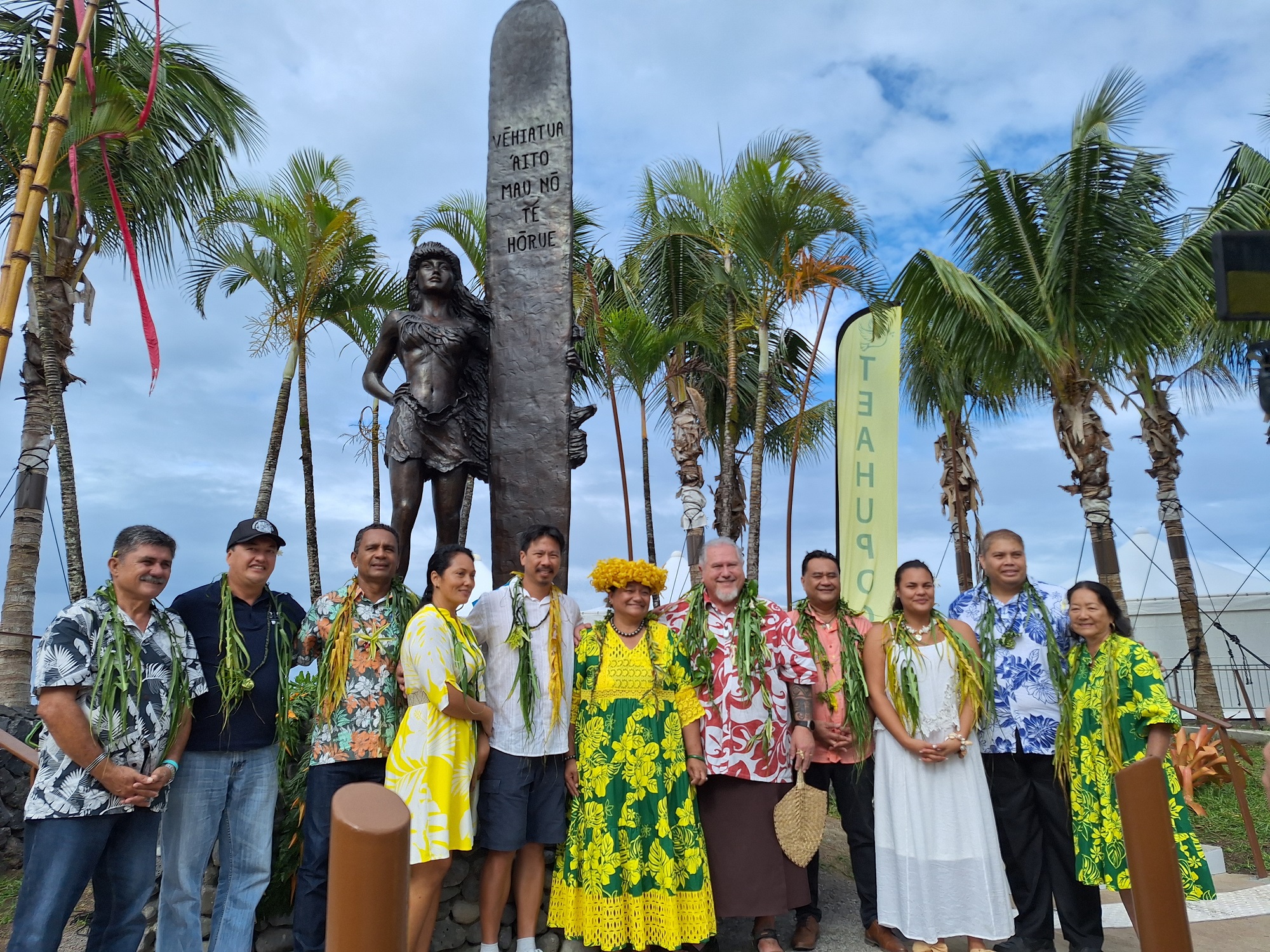 “Un puissant symbole de l’histoire du hōrue, de notre commune et de notre culture, cette œuvre d’art est bien plus qu’une simple statue. C’est le reflet de notre riche passé de traditions et de légendes. Elle raconte l’histoire de Vēhiātua-i-te-māta’i, une figure emblématique de notre patrimoine, dont le courage et la force ont traversé les âges. Vēhiātua-i-te-māta’i était une femme remarquable par son rôle de chefferie, connue pour sa souplesse, sa beauté et son agilité à surfer les vagues, cheveux aux vents. Rapide et puissante, elle attirait l’attention des rois et suscitait la jalousie des princes. Sa vie marquée par des défis et des triomphes a laissé une empreinte sur notre société, étant la première acceptée par Hava’e. Avec cette stèle, nous voulons transmettre un message de courage, de force et de réussite en mémoire des valeurs qu’elle incarne.”