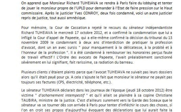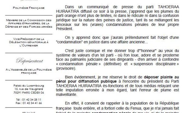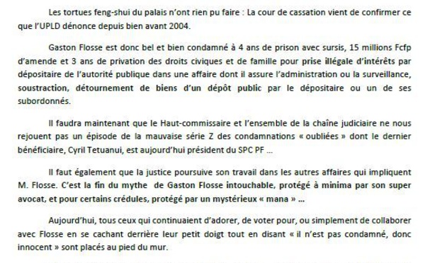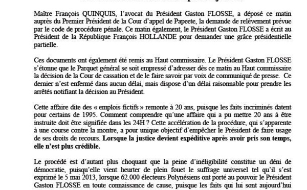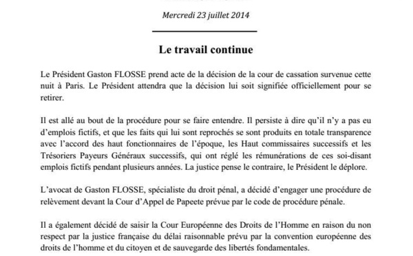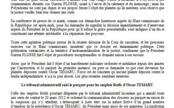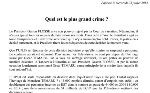 PAPEETE, le 18 juillet 2014 (COMMUNIQUE TAHOERAA) A écouter Oscar Temaru ce mercredi soir sur Polynésie 1re, le Président Gaston Flosse aurait la...