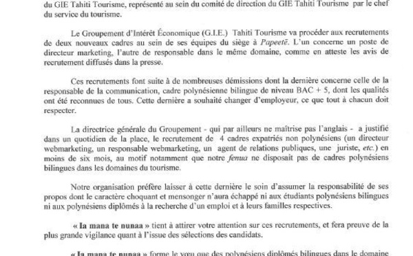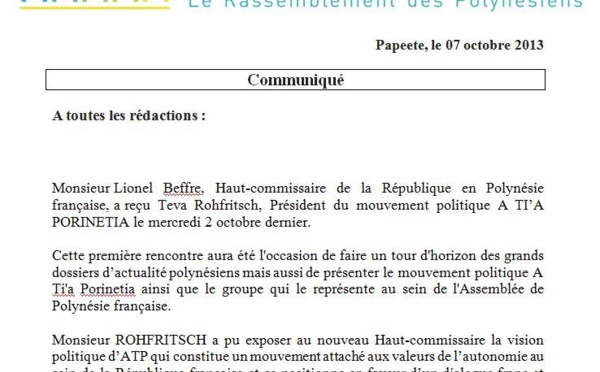 PAPEETE, mardi 22 octobre 2013 - (Communiqué du Tahoera'a Huira'atira) : La quatrième commission de l’ONU vient d’adopter une proposition de...