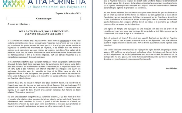 Suite à l'envoi d'un premier communiqué hier, A Ti'a Porinetia revient sur la question de la mosquée en apportant quelques précisions