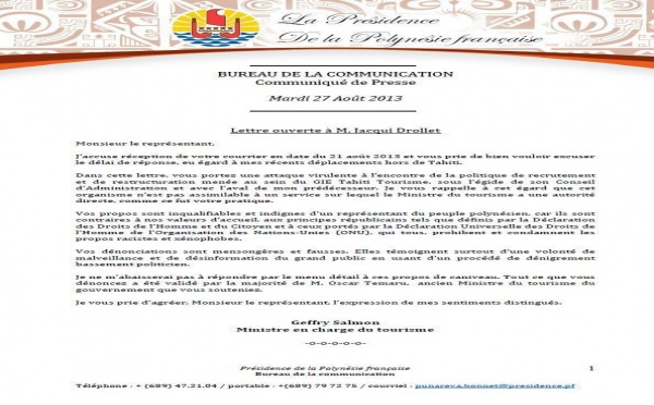 "A Monsieur Geffry SALMON, Ministre du tourisme, de l'écologie, de la culture, de l'aménagement du territoire et des transports aériens. Monsieur le...