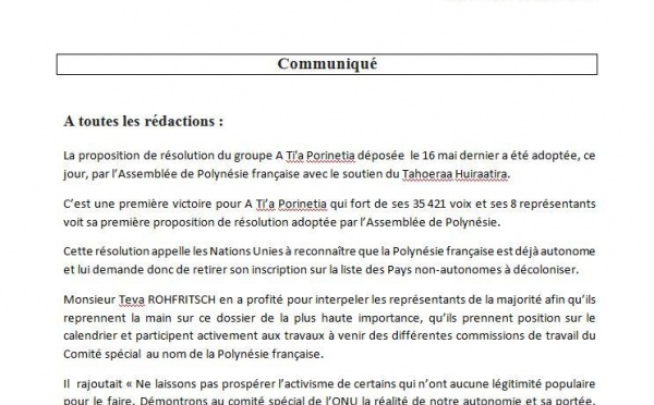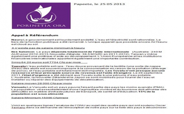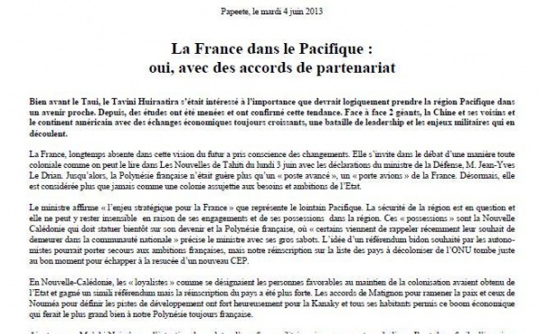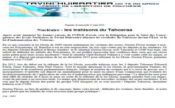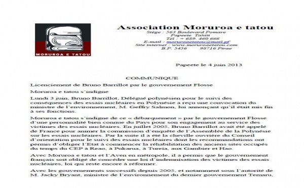 PAPEETE, vendredi 7 juin 2013 - (Communiqué du Tavini Huira'atira) : "A sa sortie du ministère de l’environnement jeudi en fin d’après midi, Bruno...
