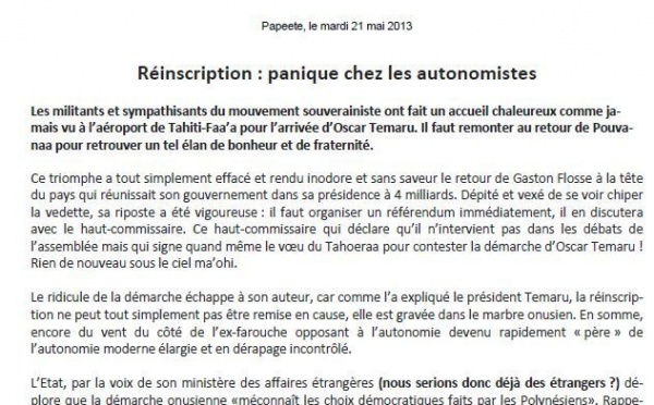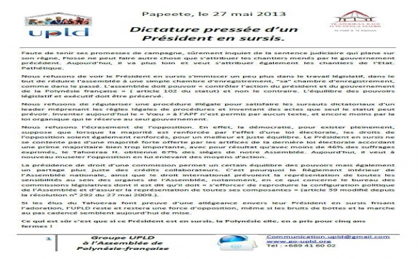 COMMUNIQUE de l'UPLD, le mercredi 15 mai 2013 : "Commémoration pour la dignité de notre peuple, ce jeudi 16 mai à la stèle de Pouvana’a a O’opa....