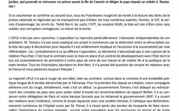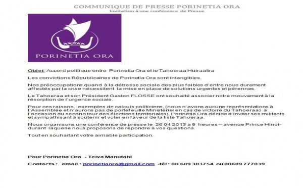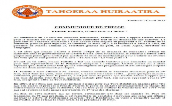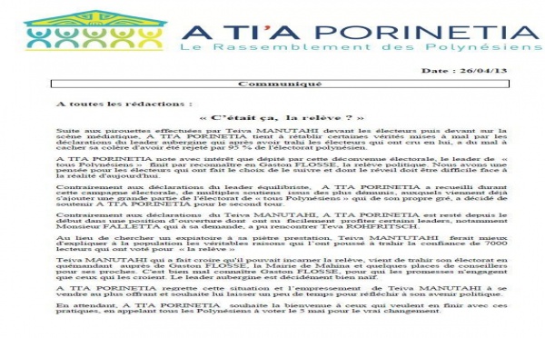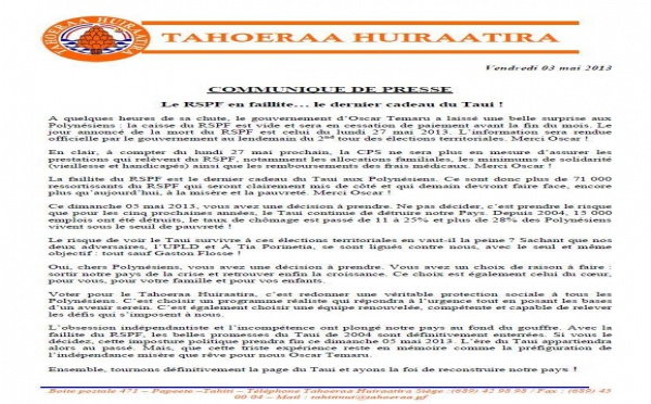 COMMUNIQUE Ia Mana Te Nunaa : "Les résultats du premier tour des élections territoriales sont connus. Le 5 mai prochain nous allons peut-être...