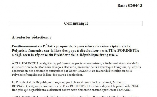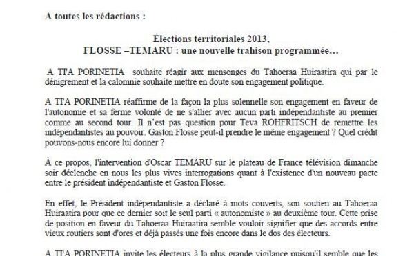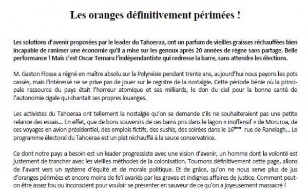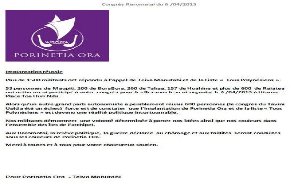 Le parti de Gaston Flosse lance son outil de campagne, un site sur lequel il est possible de télécharger la profession de foi et le programme "TAHITI...