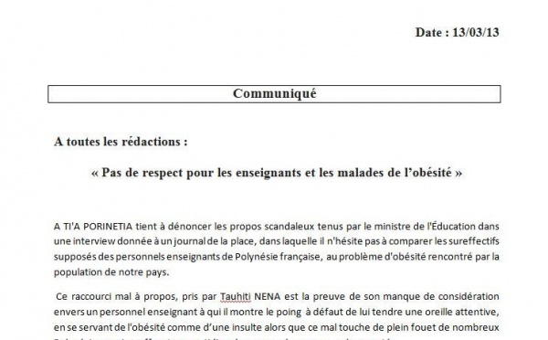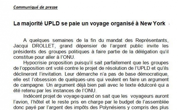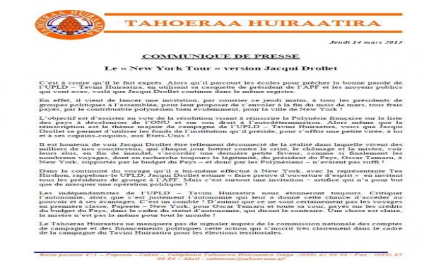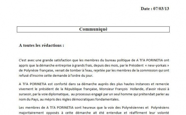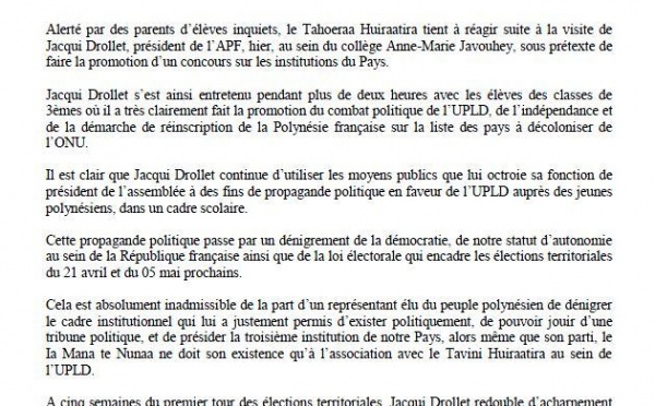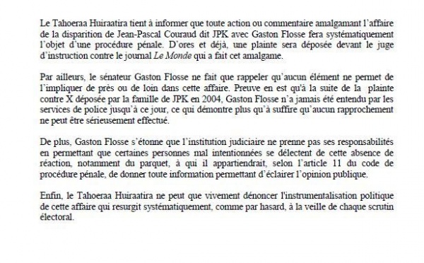 Dans un communiqué transmis à la presse, le Tahoeraa Huiraatira fait état de la réaction de Gaston Flosse suite à la publication, la semaine dernière...