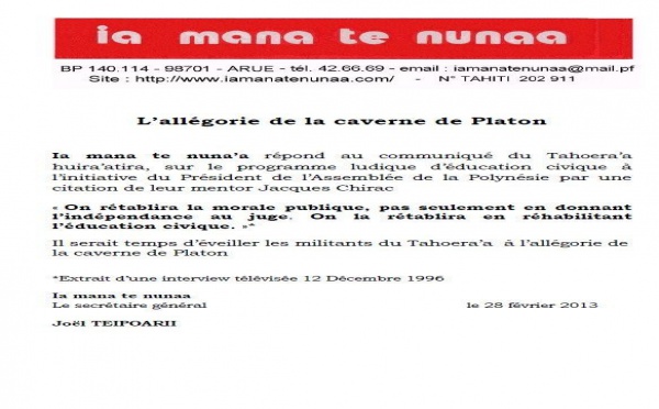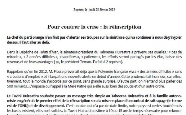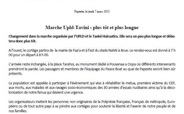 A partir du mercredi 6 mars 7 h 00, «Porinatia Ora» organise une marche populaire et républicaine. Le parti de Teiva Manutahi s'est exprimé sur sa...