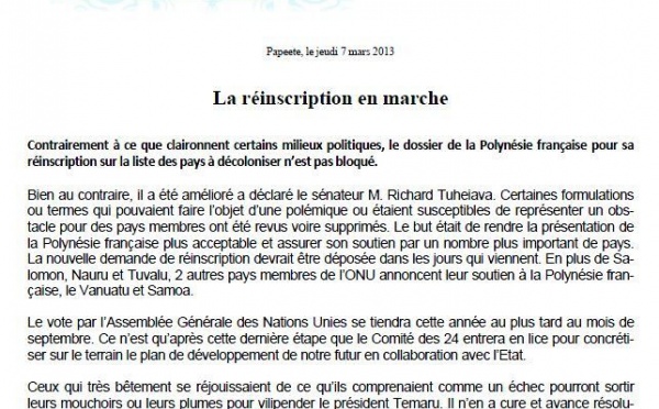 Le Taoheraa Huiraatira s'exprime au travers un communiqué sur la démarche menée par Oscar Temaru à l'ONU: "Le Tavini Huiraatira veut faire croire à...