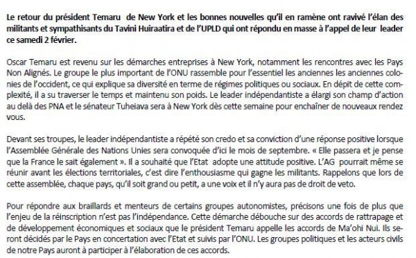 Dans la Dépêche du vendredi 8 février, il a été retranscrit dans un article relatif à la reconstitution du groupe Tahoeraa Huiraatira à l'Assemblée...
