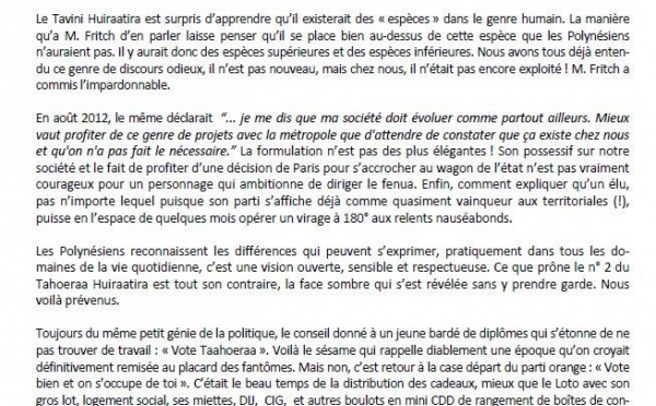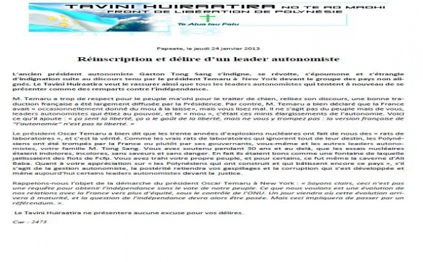 Emile Robert Ariifaanaunau Vernier a transmis par fax un courrier au Haut-Commissaire adressé au Secrétaire Général de l'ONU: à l’attention de...