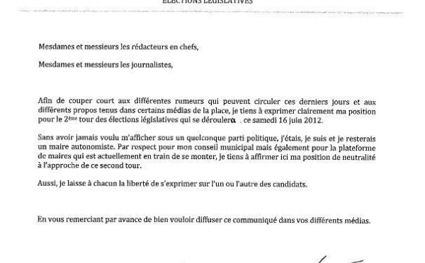 Papeete, le 12 Juin 2012: Le Ministre des Outremer du gouvernement Victorin Lurel a adressé un courier à chacun des 3 candidats de l'UPLD- Tavini,...